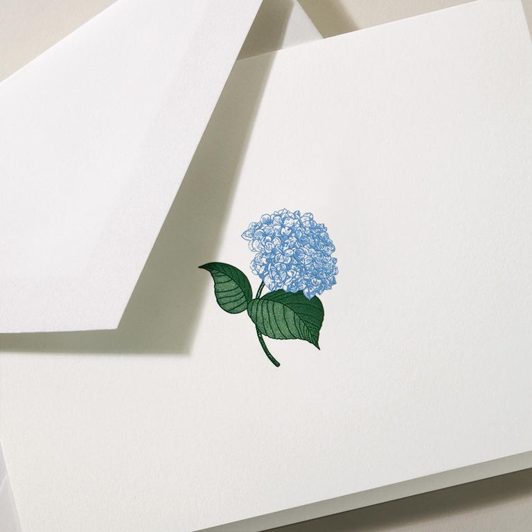 Since Victorian times, many flowers have had meanings attached. Hydrangeas are often used as a way to say "Thank You," and contemporary florists in Japan use these blooms to represent heartfelt emotion, especially love. Whether you're interested in the symbolism or just love the beautiful colors of our expertly engraved Blue Hydrangea Note, your words will flow freely inside this beautifully crafted card that feels as refreshing as a summer morning.