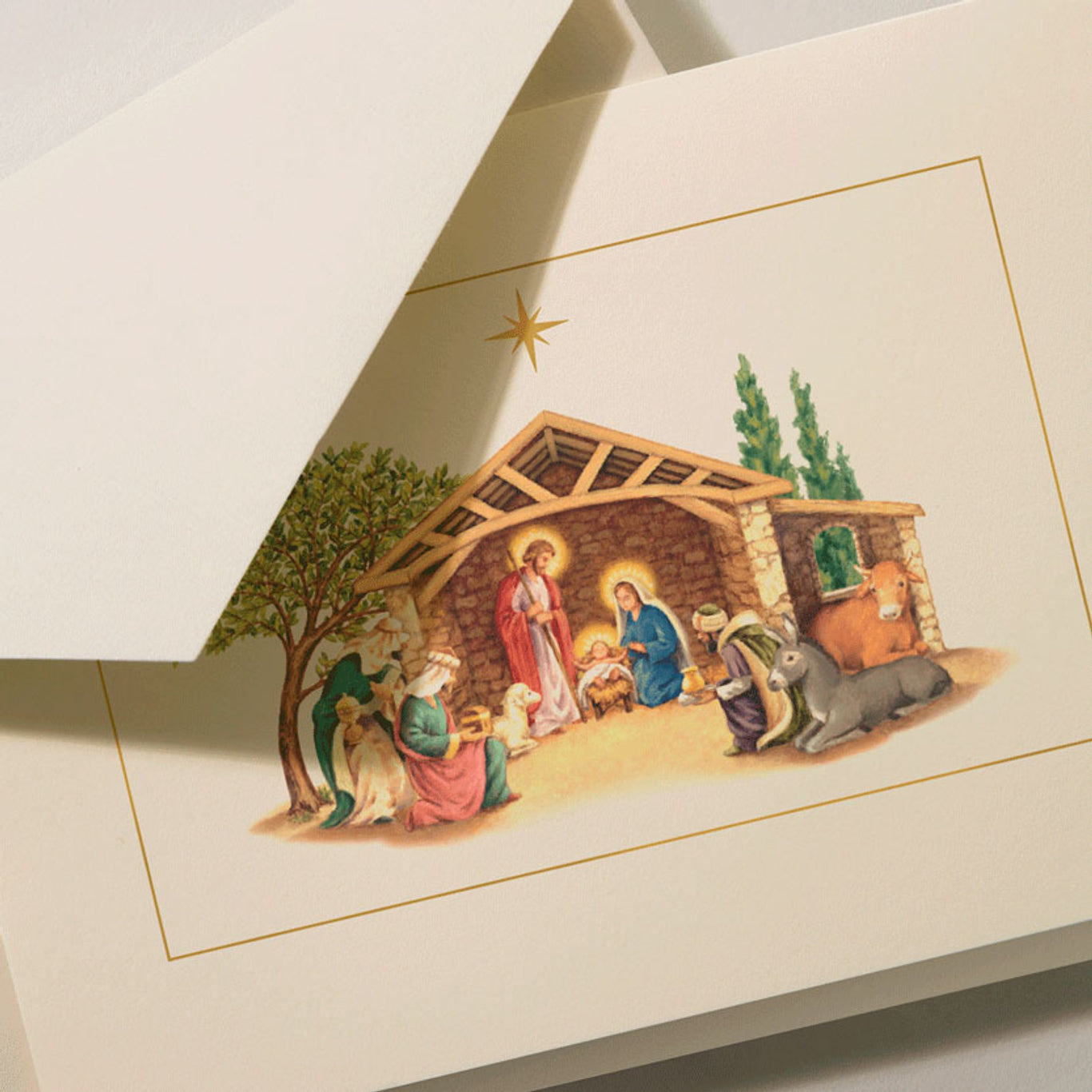 The story of Christmas is celebrated on this holiday card, which features a beautiful depiction of the iconic manger scene. A lovely reminder of why this is truly the most wonderful time of the year. The card opens to read "And His name shall be called Counsellor, the mighty God, the everlasting Father, the Prince of Peace" using gold ink. The matching envelope is lined in gold.