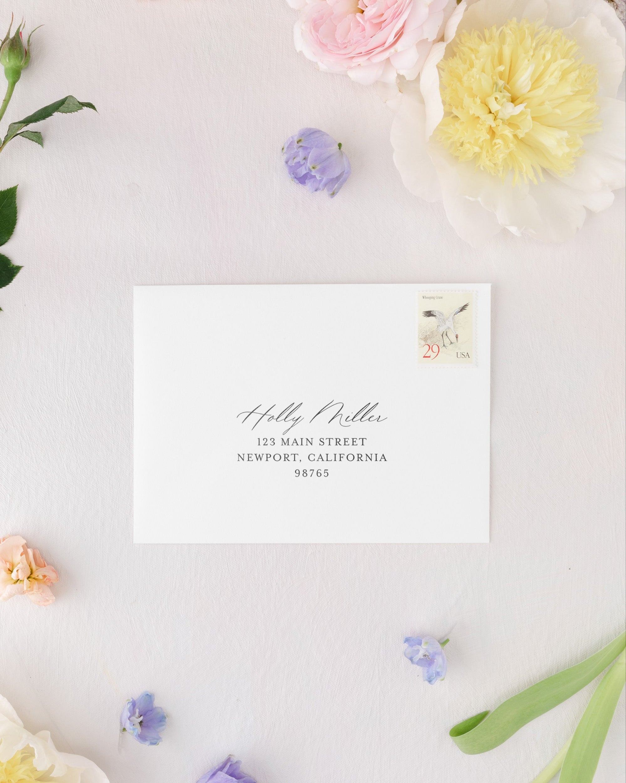 To complete the ensemble, each card is paired with a premium A2 envelope. For added elegance and convenience, return address printing is included, with optional full guest envelope addressing available for a seamless, polished presentation.