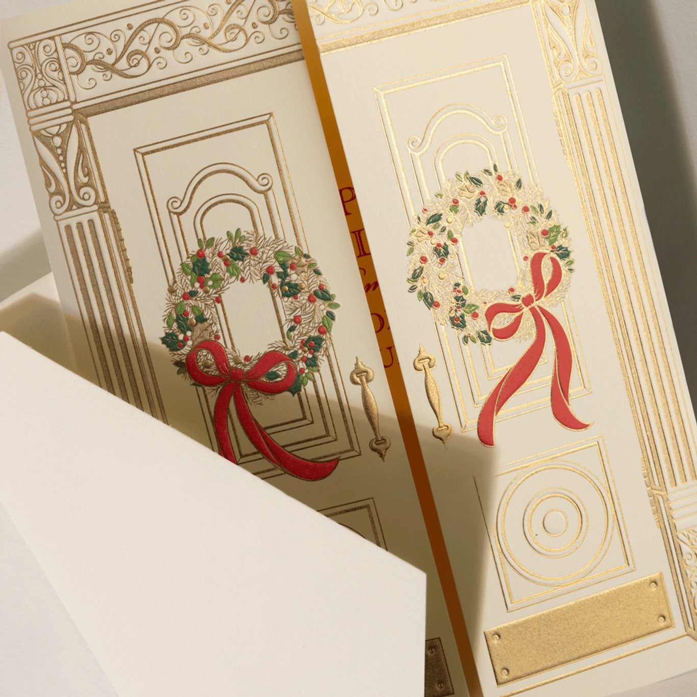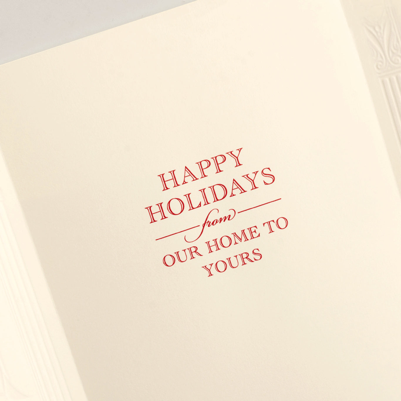We almost expect to hear carols playing as the elegant doors of our Holiday Entrance Card part to reveal your message. Our warm ecru cotton paper makes the perfect backdrop for gold engraved double doors adorned with wreaths of green, red, and gold that swing open in dramatic gatefold to reveal this heartwarming sentiment, "Happy Holidays, From our home to yours".